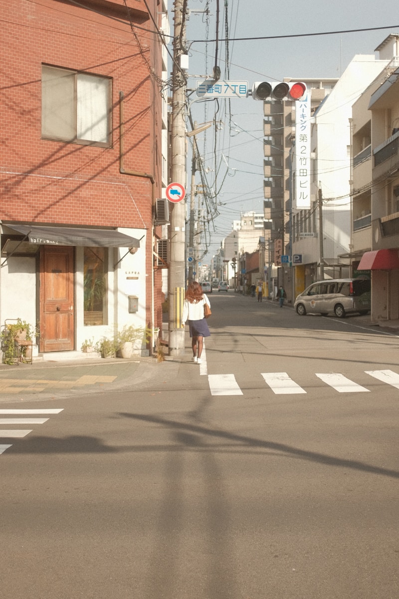 a woman walking down a street next to a traffic light